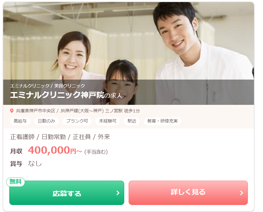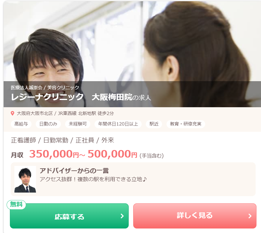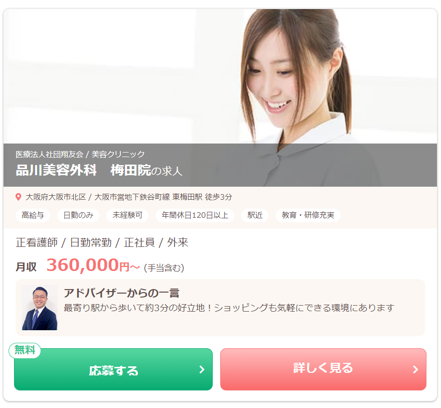 | ナース専科 | ・約20万件以上 (大阪・関西エリアの 美容クリニック看護師求人多数) |